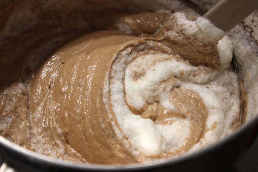 Séparez les blancs des jaunes et ajoutez les jaunes à la préparation. Fouettez jusqu’à ce qu’ils parfaitement incorporés. Ajoutez la moitié du mélange farine, cacao, bicarbonate et sel et fouettez quelques secondes. Incorporez la moitié du lait puis le reste des poudres et, enfin, le reste de lait et la vanille. Fouettez les blancs en neige et ajoutez-les délicatement à la préparation.