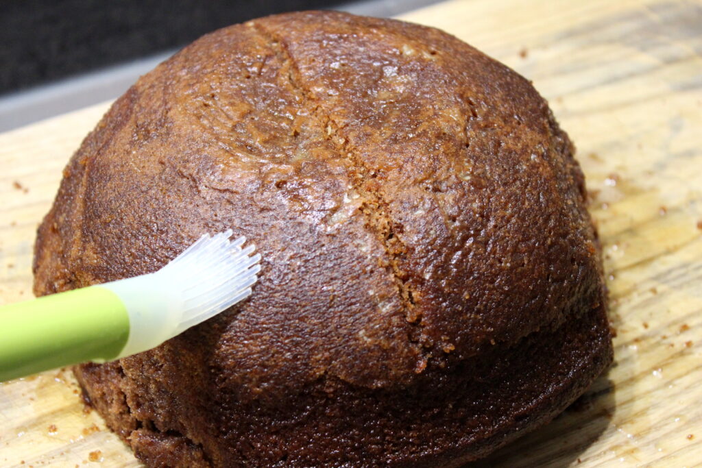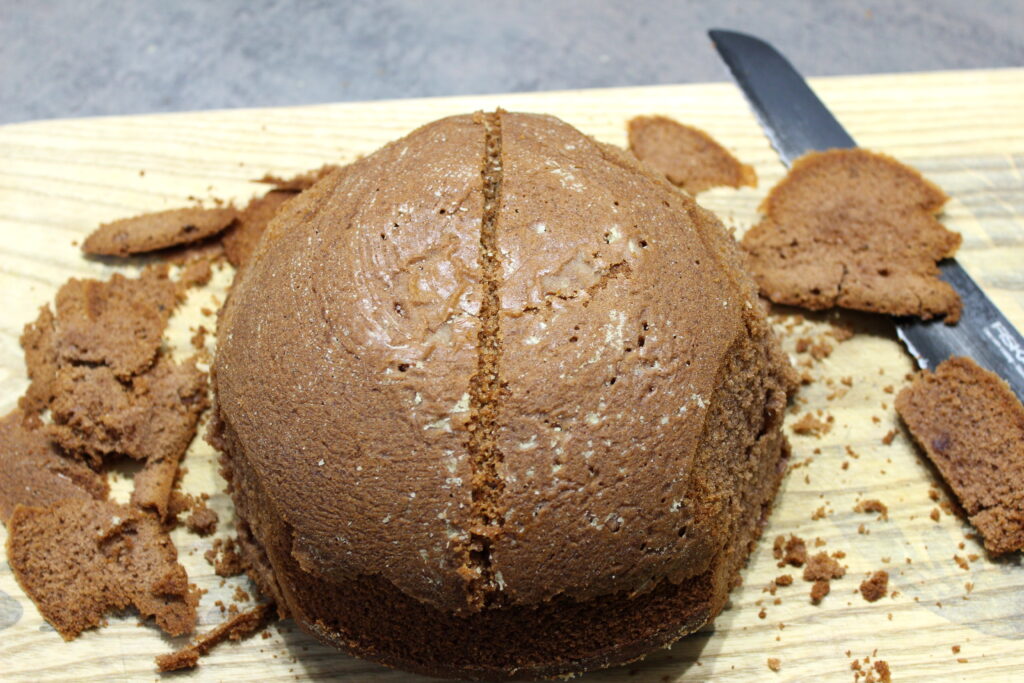 Laissez refroidir entièrement le gâteau avant de le démouler. Déposez le gâteau à l’envers sur une planche à découper et à l’aide d’un couteau, coupez les bords de votre gâteau afin d’obtenir un cerveau ovale. Découpez aussi une tranchée sur le dessus afin de délimiter les 2 hémisphères de notre cerveau.