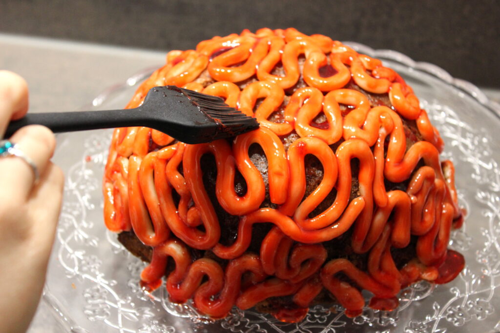 Montage : Disposez les boudins de pâte d’amande sur le gâteau. Ca a l’air fouillis mais je vous assure que le rendu final sera super. Lorsque tous les boudins de pâte sont posés sur les lobes du cerveau, préparez le coulis sanglant : Faites tiédir la gelée de groseille, le miel et le colorant rouge dans une petite casserole. Badigeonnez les boudins de pâte d’amande de ce faux sang à l’aide d’un pinceau. Je vous conseille de garder un peu de « faux-sang » et d’en badigeonner à nouveau juste avant de le servir pour un effet encore plus brillant.