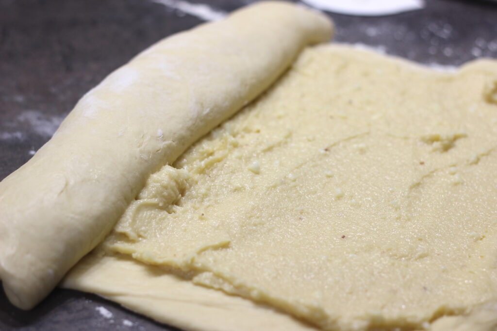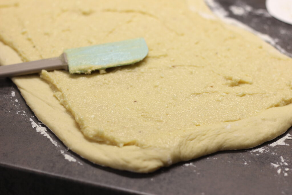Lorsqu’elle a doublé de volume, dégazez-la sur un plan de travail fariné, pétrissez-la et donnez lui la forme d’un grand rectangle. Etalez la frangipane sur le rectangle et lissez à l’aide d’une maryse.