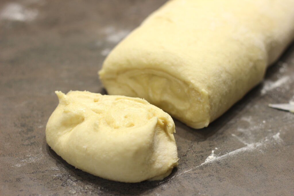 Montage : Roulez ensuite votre pâte en un long boudin sur lui-même, comme un escargot. Découpez des tronçons de pâte d’environ 3-4 cm et déposez-les dans un moule à manqué beurré et fariné ou recouvert de papier sulfurisé. Ajoutez une fève si vous voulez 🙂